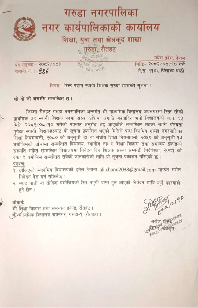 रिक्त पदमा स्थायी शिक्षक सरुवा सम्बन्धी सूचना ।