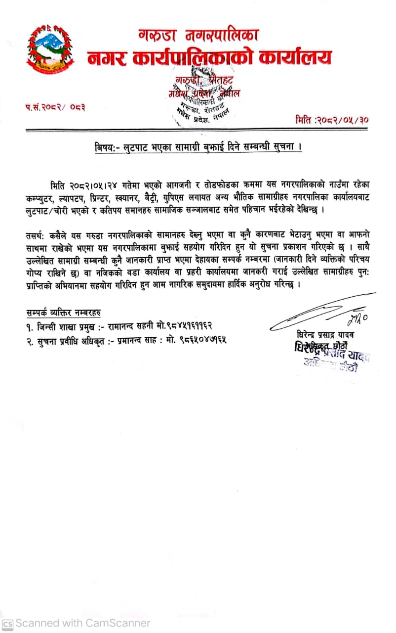 » लुटपाट भएका सामाग्री बुझाई दिने सम्बन्धी सूचना ।